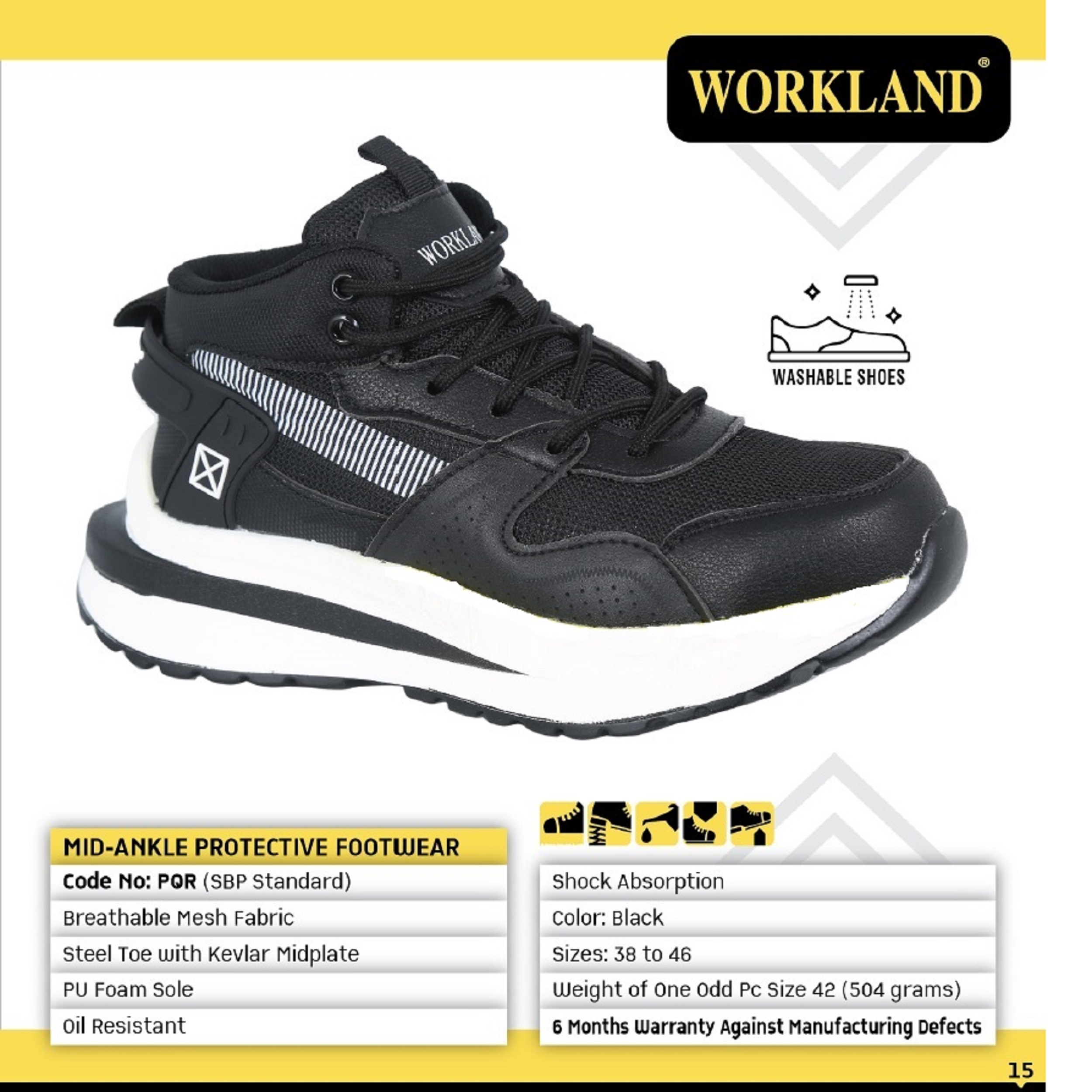 این کفش از برند WORKLAND تولید شده در کشور چین می باشد . وزن این کفش نسبتا سبک بود و هر لنگه آن ( سایز 42 ) 500 گرم وزن دارد . طراحی ان بسیار اسپرت و ظریف بوده و اصلا به نظر کفش ایمنی بنظر نمی رسد . جنس رویه آن ترکیبی از چرم مصنوعی و برزنت ضد آب می باشد . سرپنجه این کفش از جنس استیل است . زیره کفش از جنس PU , آنتی شوک و ضد لغزش بوده و دارای خاصیت انعطاف پذیری بسیار خوبی می باشد .