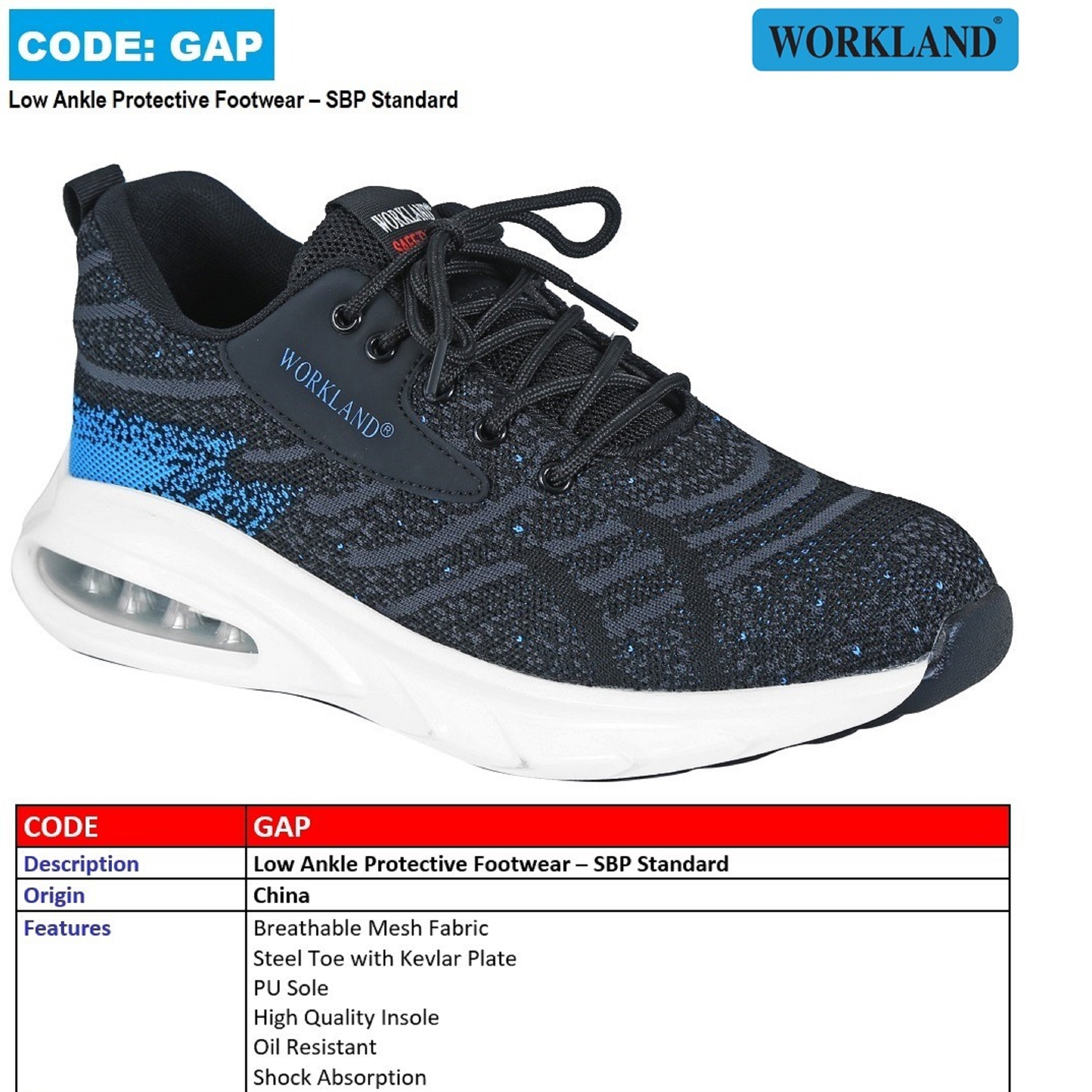 این مدل کفش متعلق به برند WORKLAND تولید شده در کشور چین می باشد . وزن این کفش نسبتا سبک بود و هر لنگه آن ( سایز 42 ) تنها 500 گرم وزن دارد . طراحی ان بسیار اسپرت و ظریف بوده و اصلا به نظر کفش ایمنی بنظر نمی رسد . جنس رویه آن ترکیبی از پارچه بافت مش تنفس پذیر با طراحی بسیار زیبا و چشمگیر می باشد . سرپنجه این کفش از جنس استیل مقاوم در برابر 200 ژول ضربه و فشار می باشد . زیره کفش از جنس PU , آنتی شوک و ضد لغزش بوده و دارای خاصیت انعطاف پذیری بسیار خوبی می باشد . در قسم پاشنه پا یک فضای کپسولی شک طراحی شده که به نرمی کفش هنگام قدم برداشتن بسیار کمک بالایی می کند .