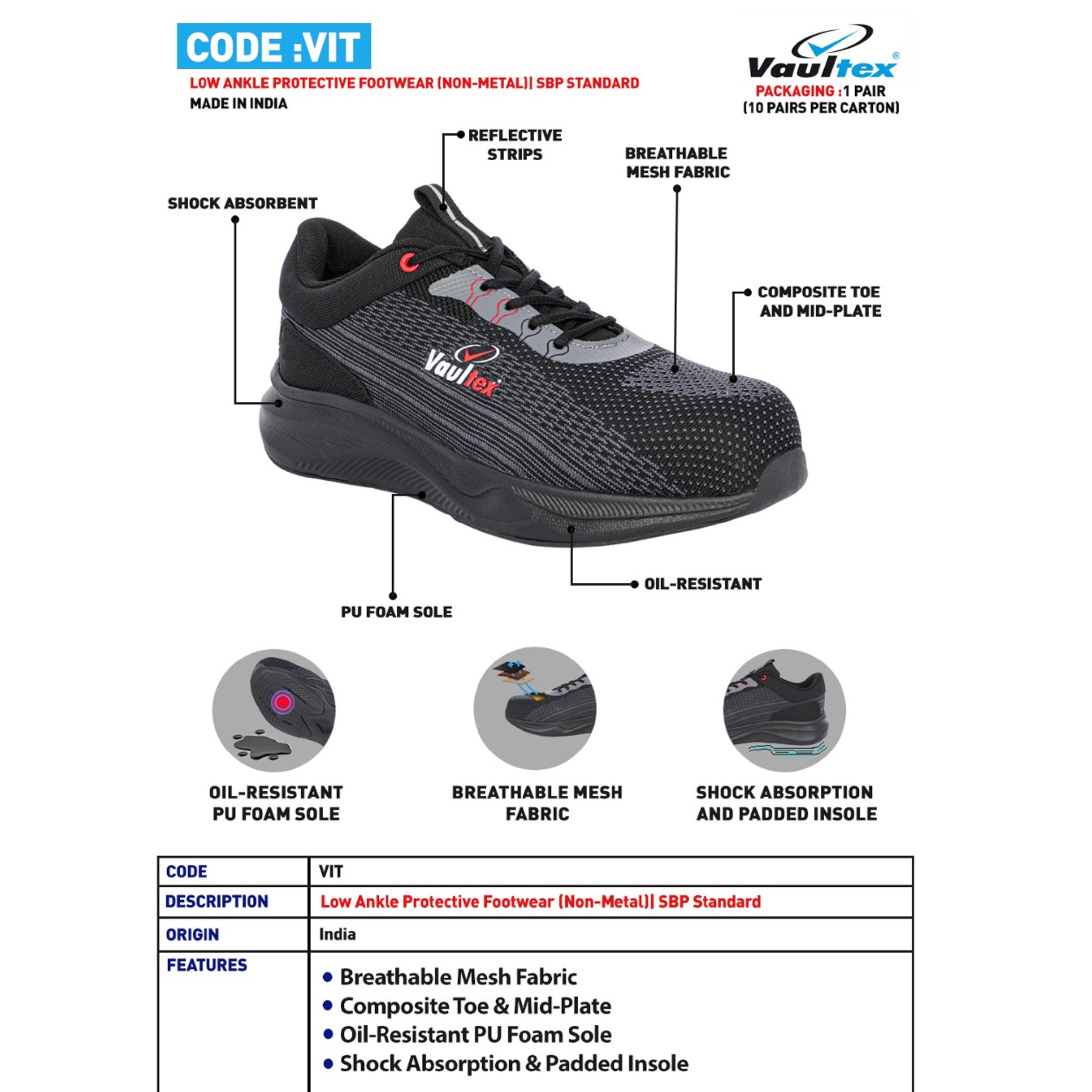 این کفش از برند ولتکس تولید شده در کشور هند می باشد. وزن این کفش بسیار سبک است و وزن هر لنگه آن در سایز 42 تنها 400 گرم می باشد. جنس رویه آن پارچه مش ریز بافت تنفس پذیر می باشد . سرپنجه این کفش از جنس کامپوزیت مقاوم تا 200 ژول در برابر ضربه و فشار است . زیره میانی کفش از جنس PU FOAM با ویژگی OIL RESISTANT می باشد .در لایه میانی کفش ورق کامپوزیت جهت نفوذناپذیری زیره کفش در برابر میخ و اشیاء نوک تیز قرار داده شده است . همچنین زیره کفش دارای خاصیت ضربه گیری ( SHOCK ABSORBATION ) تا راحتی بیشتری برای شما هنگام قدم زدن تامین کند . . با توجه به وزن پایین ان این کفش برای طبیعت گردی و کوه نوردی هم پیشنهاد می گردد .کفش FREE METAL بوده و عایق برق تا 220 ولت می باشد .