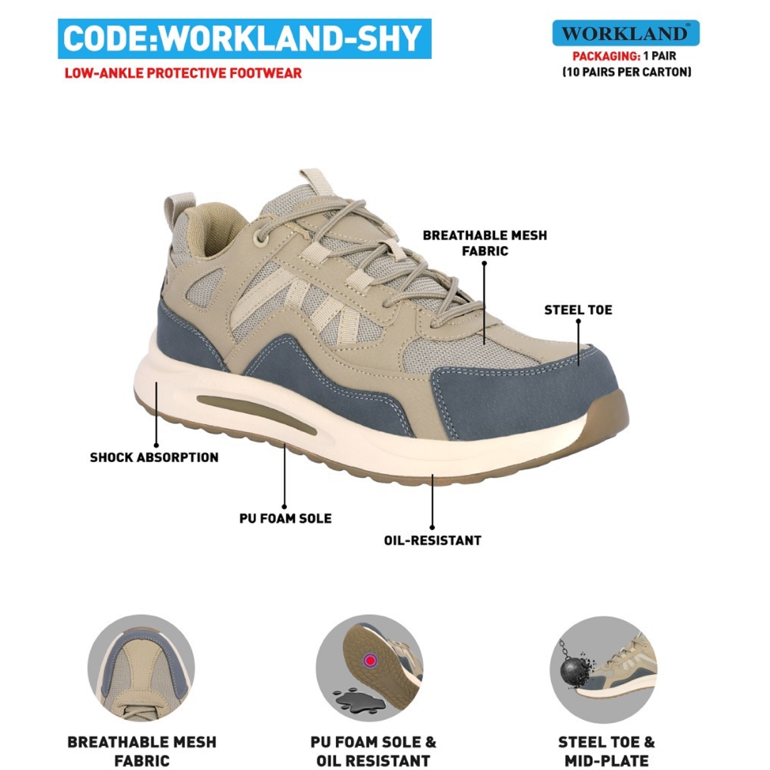 این مدل کفش متعلق به برند WORKLAND تولید شده در کشور چین می باشد .کفش در بخش رویه و زیره دارای کیفیت بسیار بالایی می باشد . طراحی آن بسیار اسپرت و ظریف بوده و اصلا در نگاه اول کفش ایمنی بنظر نمی رسد . جنس رویه آن ترکیبی از مش و چرم می باشد که باعث شده کفش دارای تنفس پذیری مناسبی می باشد . سرپنجه این کفش از جنس استیل مقاوم در برابر 200 ژول ضربه و فشار است . زیره کفش از جنس PU FOAM و آنتی شوک ( SHOCK ABSORPTION جاذب ضربه ) و ضد لغزش و همچنین مقاوم در برابر روغن و مشتقات نفتی می باشد . وزن هر لنگه این کفش ( سایز 43) 550 گرم بوده و سبک است .