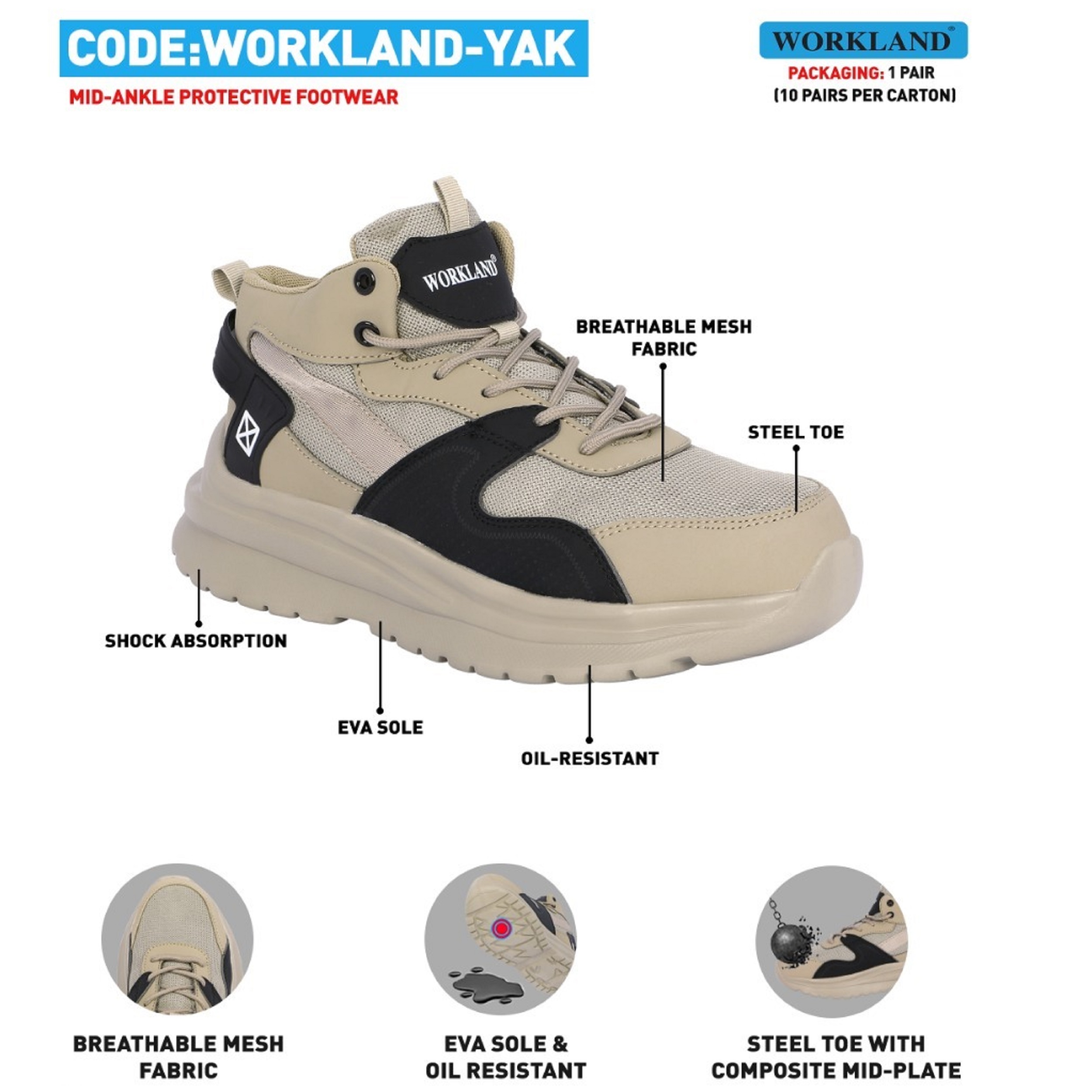 این مدل کفش متعلق به برند WORKLAND تولید شده در کشور چین می باشد .کفش در بخش رویه و زیره دارای کیفیت بسیار بالایی می باشد . طراحی آن بسیار اسپرت و ظریف بوده و اصلا در نگاه اول کفش ایمنی بنظر نمی رسد . جنس رویه آن ترکیبی از مش و چرم می باشد که باعث شده کفش دارای تنفس پذیری مناسبی می باشد . سرپنجه این کفش از جنس استیل مقاوم در برابر 200 ژول ضربه و فشار است . زیره کفش از جنس EVA و آنتی شوک ( SHOCK ABSORPTION جاذب ضربه ) و ضد لغزش و همچنین مقاوم در برابر روغن و مشتقات نفتی می باشد . وزن هر لنگه این کفش ( سایز 43) 500 گرم بوده و سبک است .