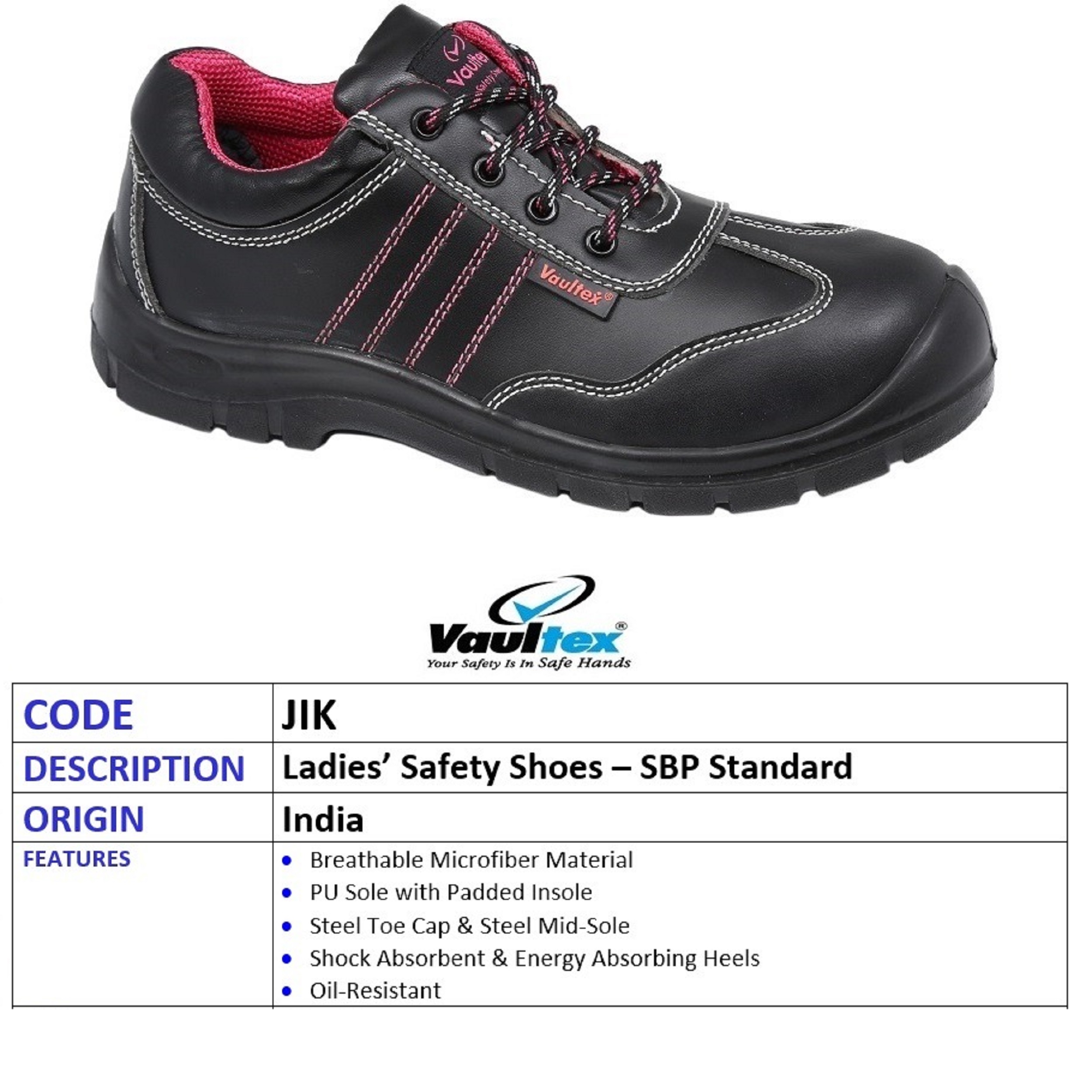 این مدل کفش متعلق به برند VAULTEX تولید شده در کشور هند می باشد .این مدل کفش با طراحی ظریف ویژه برای خانم ها تولید شده است و آستر صورتی رنگ آن زیبایی خاصی به آن داده است . کفش دارای وزن سبک بوده و هر لنگه آن کمتر از 500 گرم وزن دارد. جنس رویه آن چرم طبیعی تنفس پذیر می باشد . کفش های ایمنی زنانه ساق پا پایین Vaultex JIK SBP برای محافظت در محیط های کاری صنعتی طراحی شده اند. این کفش ایمنی دارای یک کلاهک فولادی برای محافظت از انگشتان پا در برابر ضربه و فشار است و همچنین دارای کفی مقاوم در برابر لغزش برای جلوگیری از لغزش و افتادن است.طراحی پایین مچ پا تحرک و راحتی بیشتری را فراهم می کند و کفش ها از مواد با کیفیت بالا ساخته شده اند تا در طول روز کاری دوام داشته باشند. کفشهای Vaultex تست شدهاند و استانداردهای ایمنی لازم را دارند و رتبه ایمنی SBP را کسب کردهاند.کفش ایمنی Vaultex JIK SBP Low Ankle مخصوص پاهای زنانه طراحی شده است که تناسب و راحتی بهتری را برای پوشنده فراهم می کند. رنگ مشکی هم شیک و هم کاربردی است که باعث می شود کفش به راحتی در محیط کار قابل مشاهده باشد.