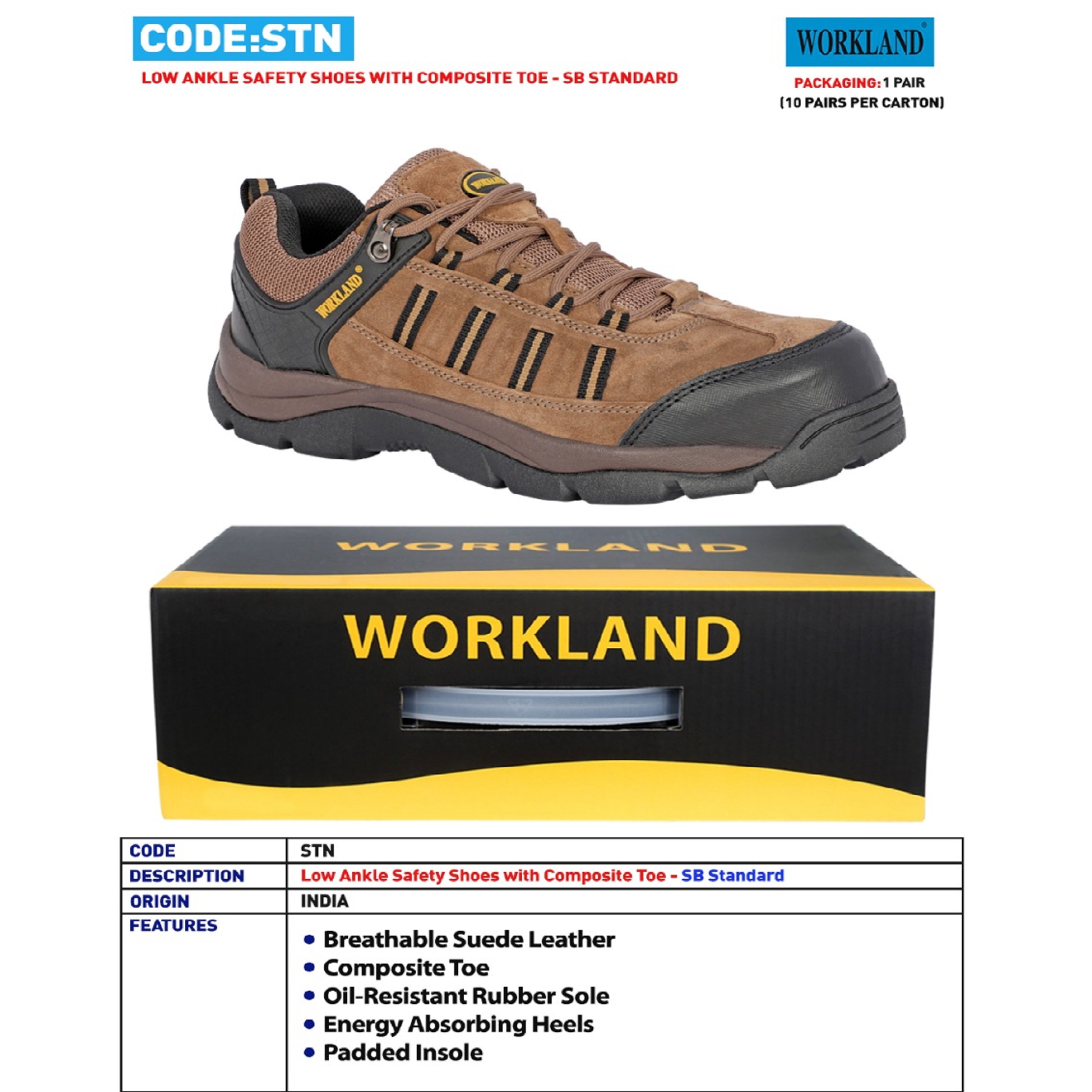 این مدل کفش متعلق به برند WORKLAND تولید شده در کشور هند می باشد .کفش در بخش رویه و زیره دارای کیفیت بسیار بالایی می باشد . طراحی آن بسیار اسپرت و ظریف بوده و اصلا در نگاه اول کفش ایمنی بنظر نمی رسد . جنس رویه آن از چرم جیر بوده و کفش دارای تنفس پذیری مناسبی می باشد . سرپنجه این کفش از جنس کامپوزیت است . زیره کفش از جنس EVA و لاستیک و آنتی شوک ( SHOCK ABSORPTION جاذب ضربه ) و ضد لغزش و همچنین مقاوم در برابر روغن و مشتقات نفتی می باشد . وزن هر لنگه این کفش ( سایز 43) 490 گرم بوده و سبک است . این کفش FREE METAL بوده و عایق برق 220 ولت می باشد .
